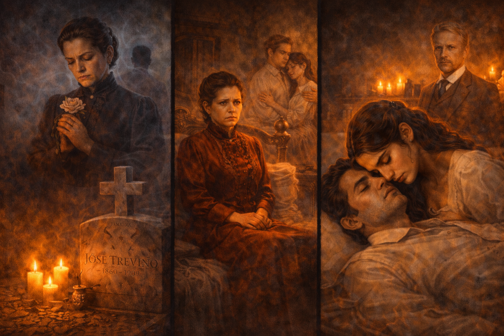 Del mismo modo, la resignación de la protagonista antagónica a permanecer viuda, pese a aún tener juventud y fuerzas para casarse y rehacer su vida, constituye un destino similar al de su primogénita, hija menor y del doctor John Brown. En su juventud, Elena de la Garza tiene un amante llamado José Treviño a quien no puede desposar por ser un hombre de raza negra. Obligada por las circunstancias, contrae matrimonio con Juan de la Garza, con quien procrea a sus tres hijas. Debido a la falsedad de su matrimonio y al afecto que siente por José, le es infiel a su esposo hasta la muerte del hombre al que nunca deja de querer. Tanto así que, al fallecer su cónyuge, decide no casarse de nuevo, por fidelidad al sentimiento imposible.
