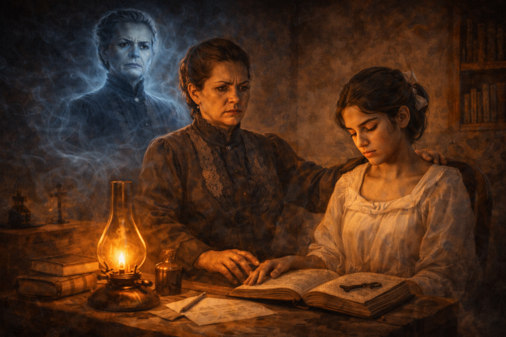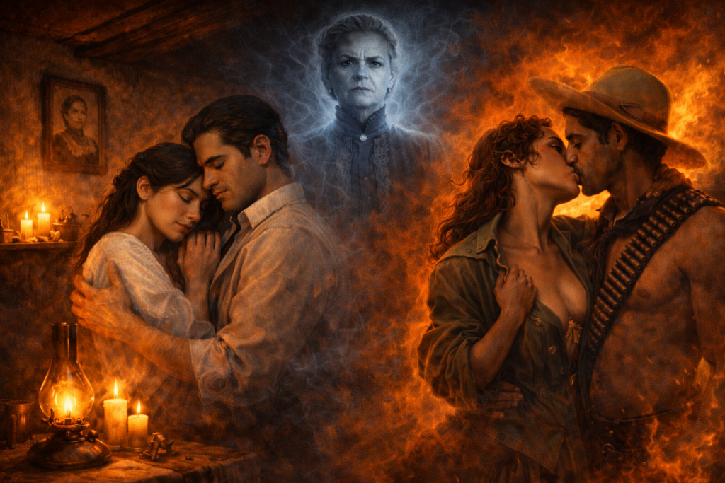 La negativa de la joven cocinera y el odio que, por vez primera, le confiesa a su figura materna causan aún más enojo en el espectro que sale del cuarto girando con furia e incendiando un quinqué de petróleo que estaba cerca de Pedro, quien sufrió quemaduras de mucha gravedad (172–73). Como se puede observar, Mamá Elena es una fuerza punitiva que trasciende la muerte, ya que su autoridad moral se traduce en violencia al castigar el amor y la libertad de los protagonistas en un acto de destrucción y venganza.